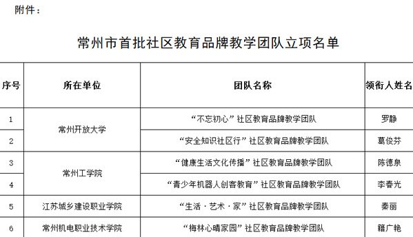 近日,常州开放大学发文公布了常州市首批社区教育品牌教学团队立项评审结果,我校陈德泉领衔的“健康生活文化传播”社区教育品牌团队和李春光领衔的“青少年机器人创客教育”社区教育品牌团队获批立项。