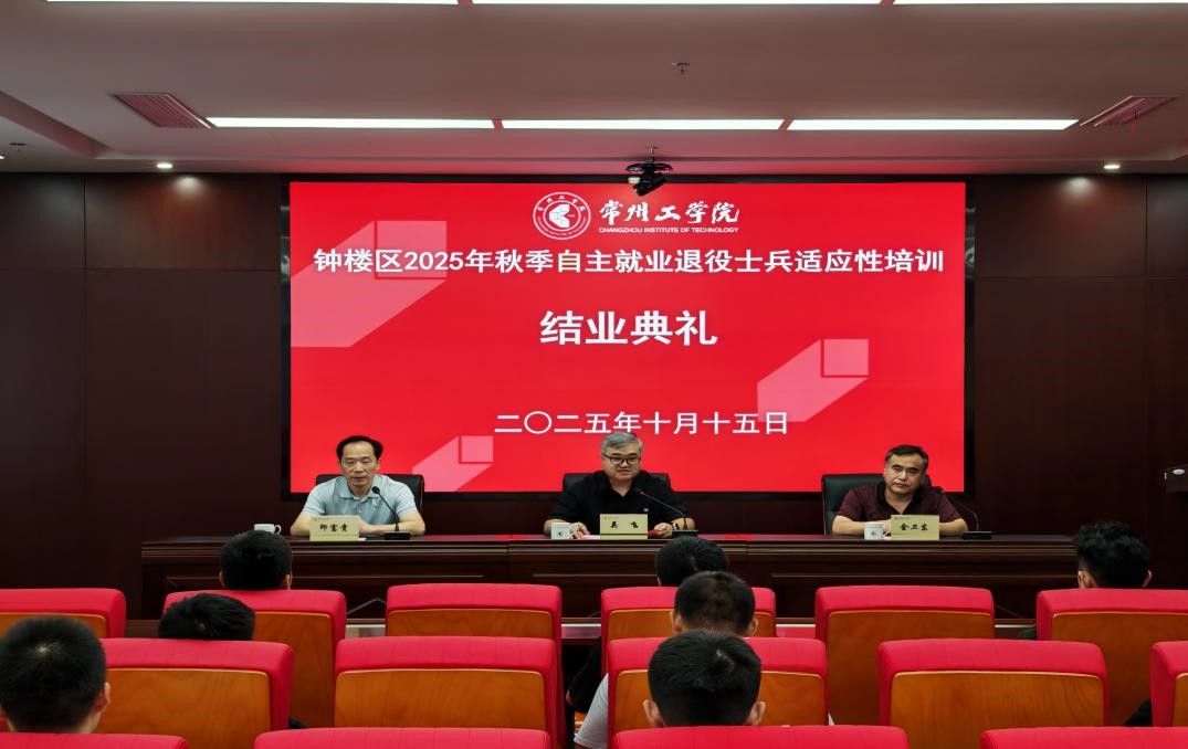 2025年10月15日下午,钟楼区2025年秋季自主就业退役士兵适应性培训结业典礼在我校举行。钟楼区退役军人事务局副局长吴飞、常州工学院继续教育学院院长金卫东等出席典礼,继续教育学院副院长印富贵主持典礼。27名参训学员顺利取得结业证书,3名学员获颁“优秀学员”。