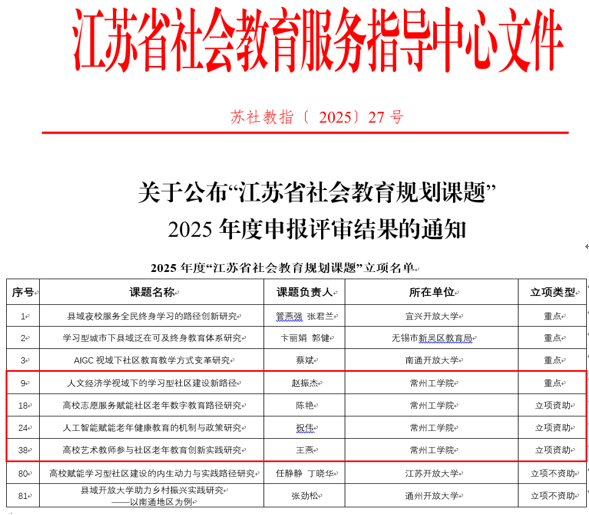 年度江苏省社会教育规划课题评审结果,我校赵振杰、陈艳、祝伟和王燕老师申报的四个课题获批立项。